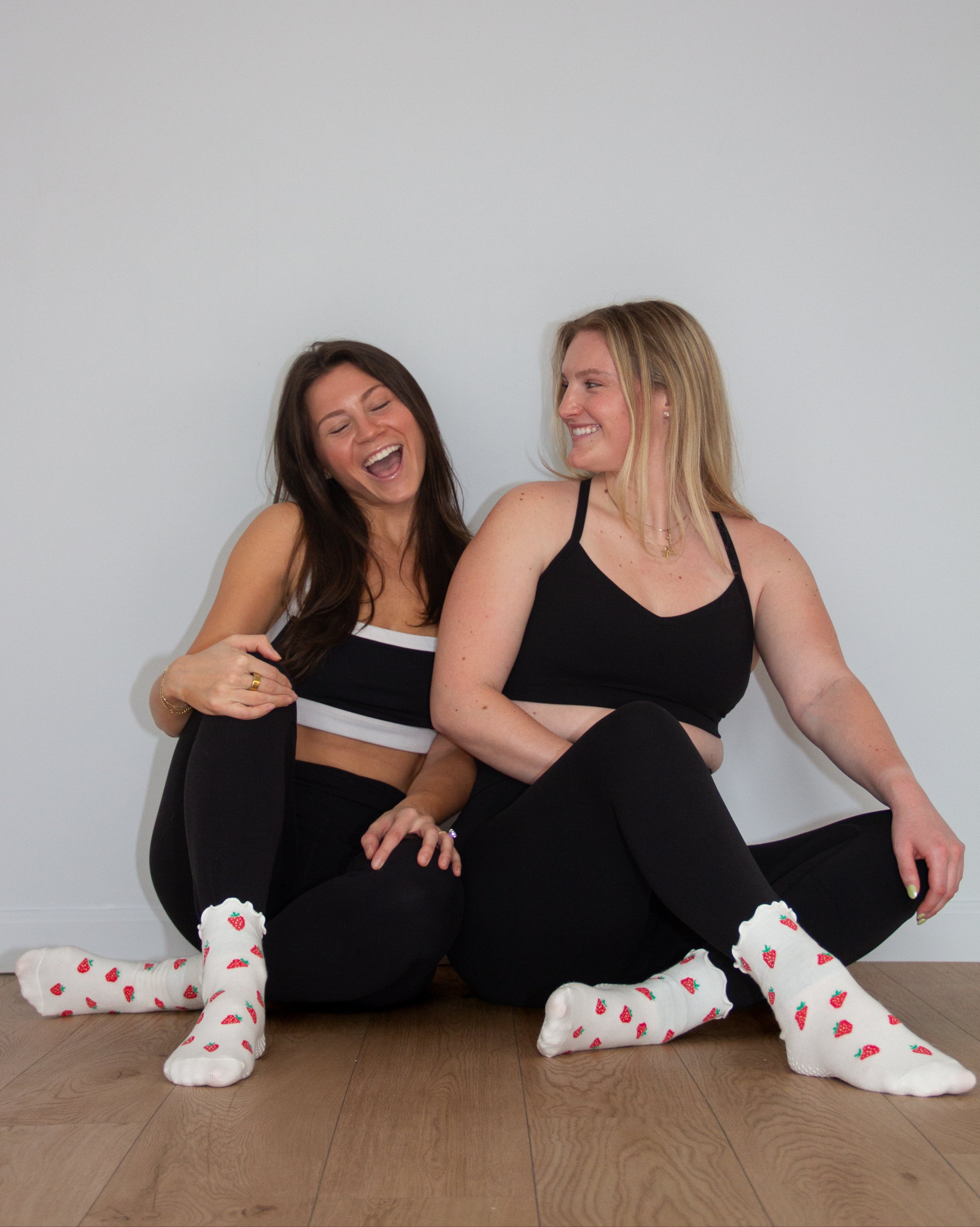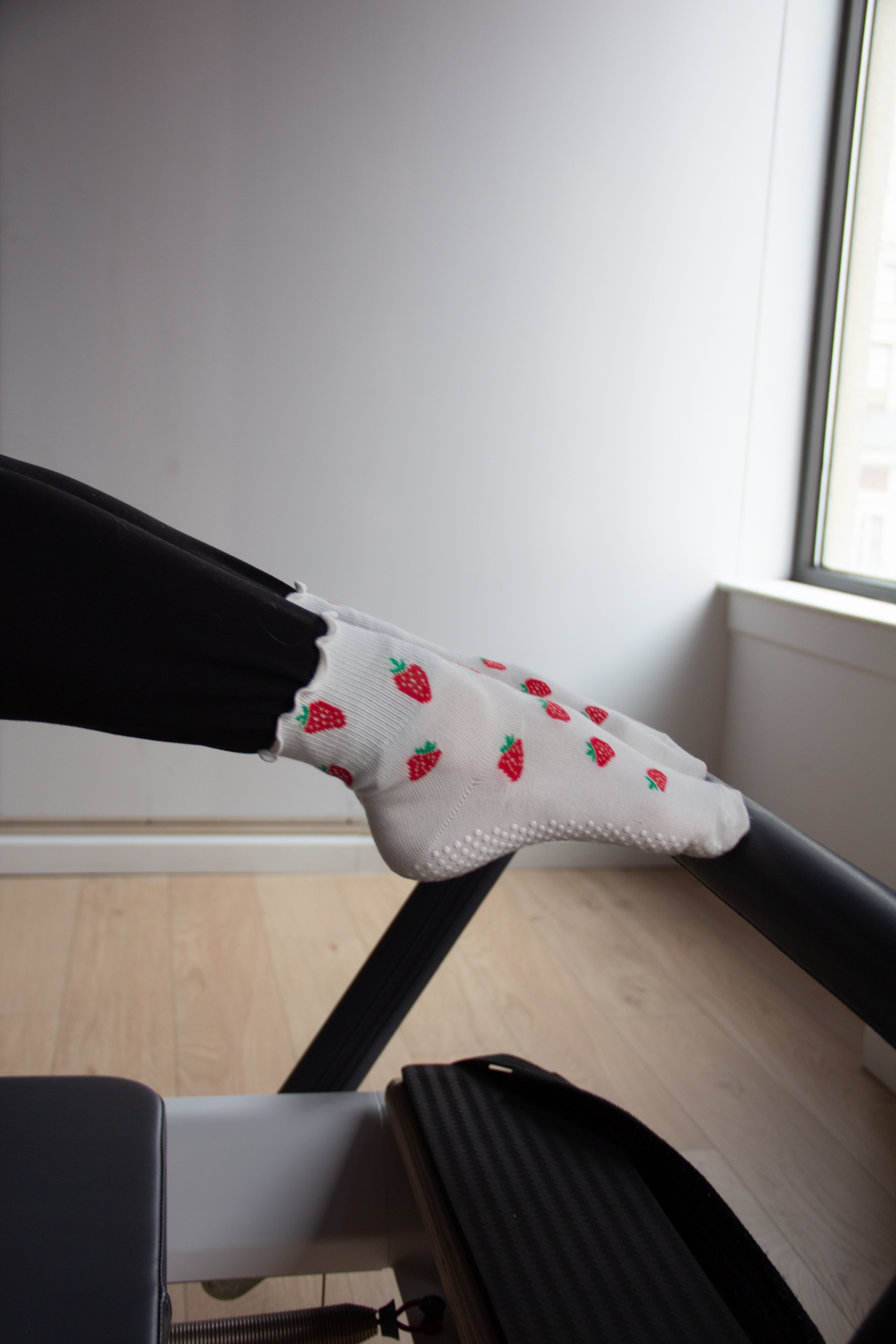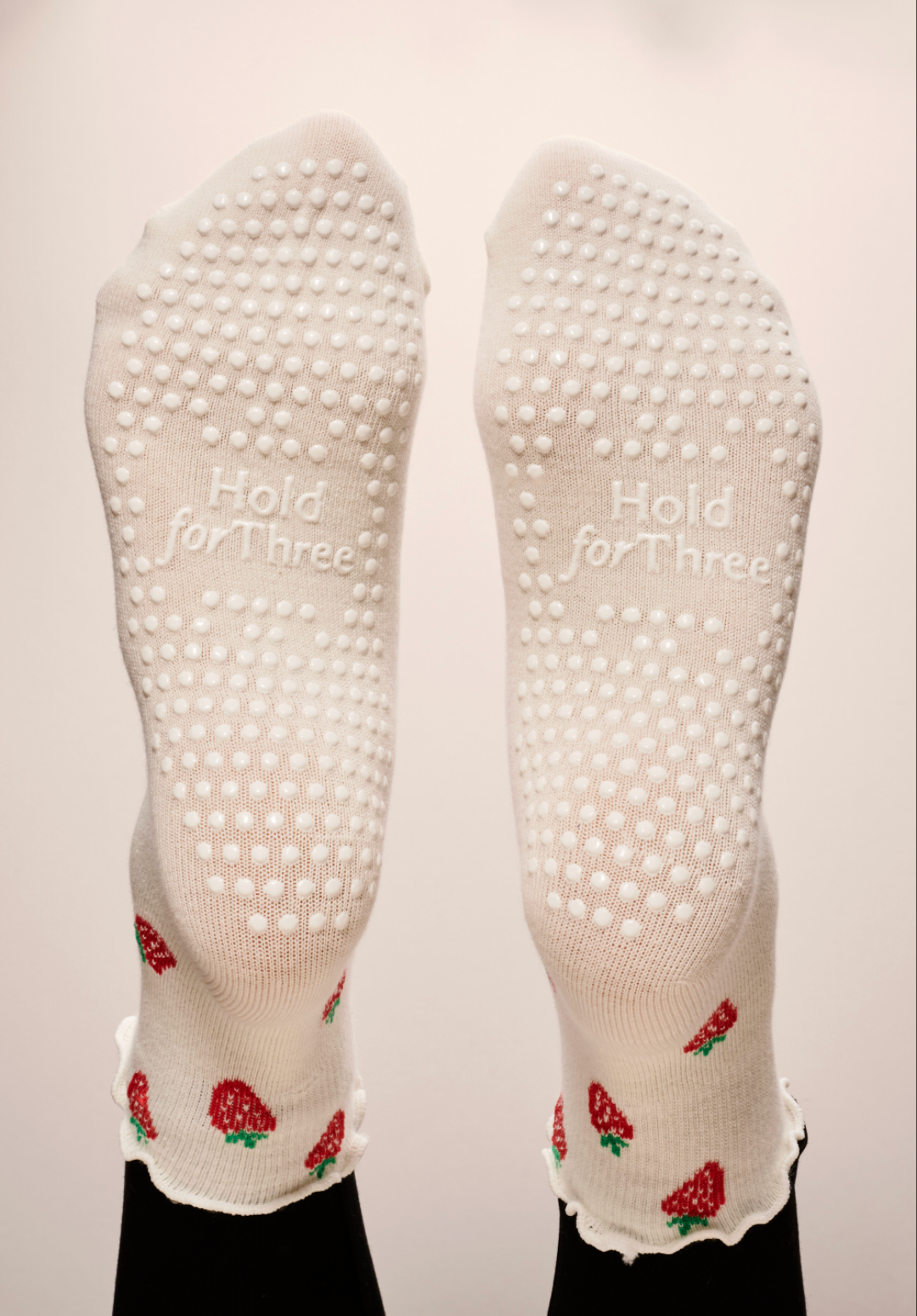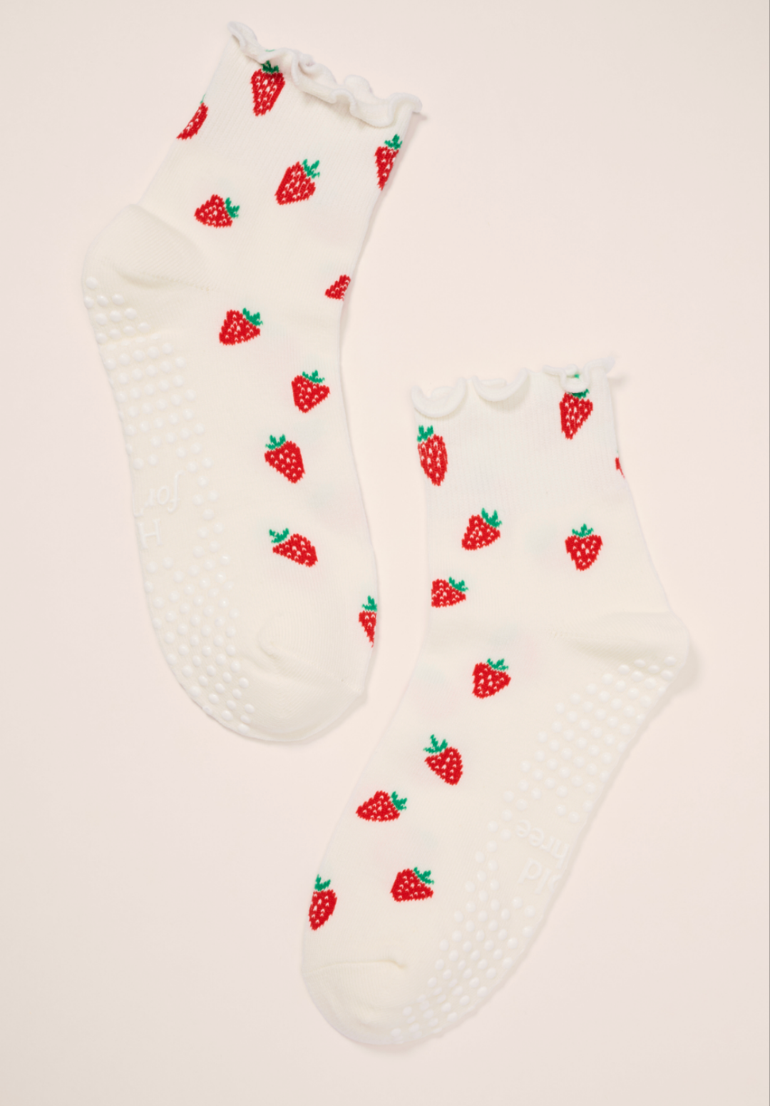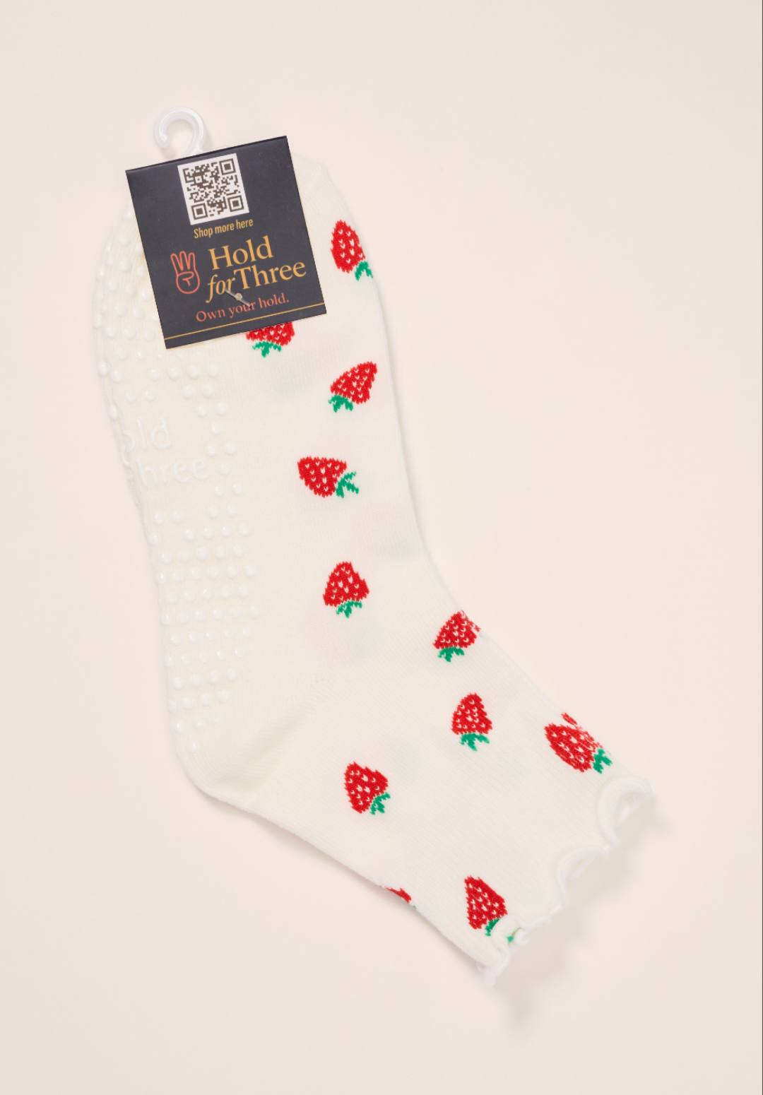Off white above the ankle frill socks with strawberry design. White grips on bottom.