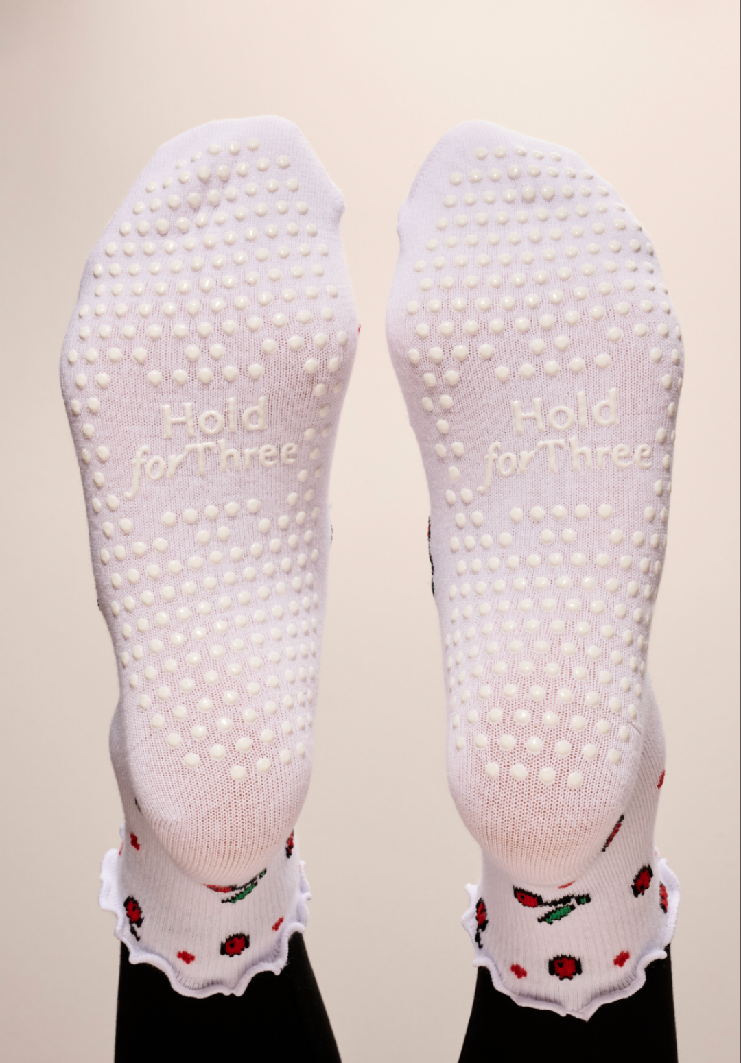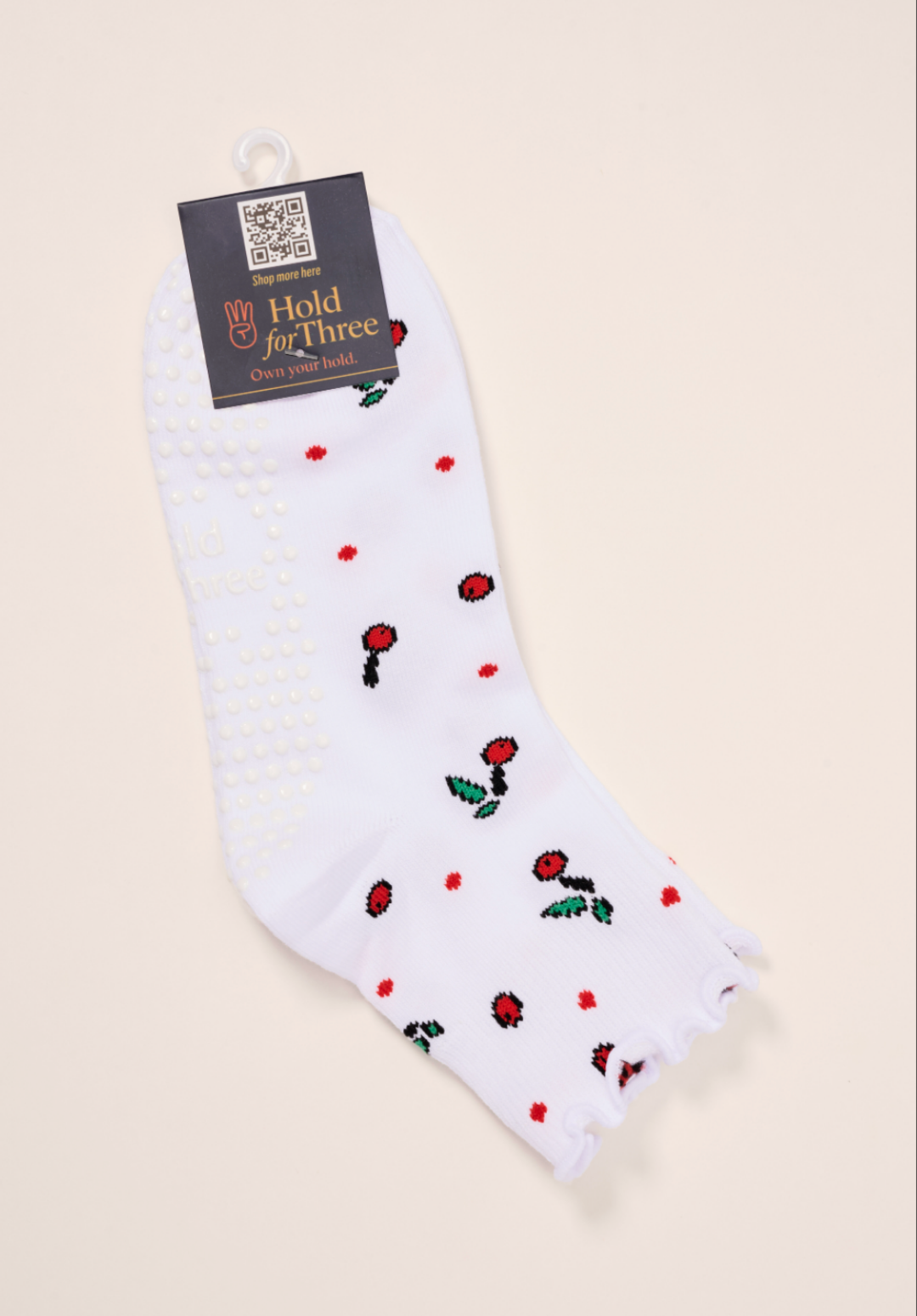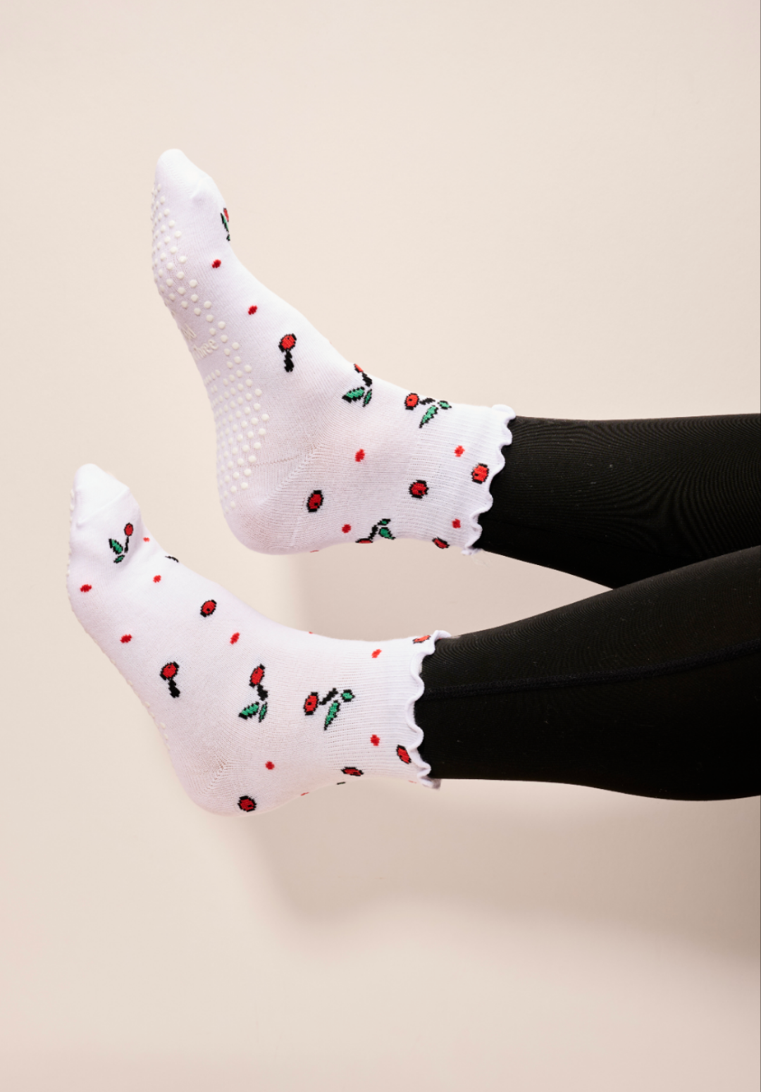 White above the ankle socks with cherry design & frill. Grips on bottom.